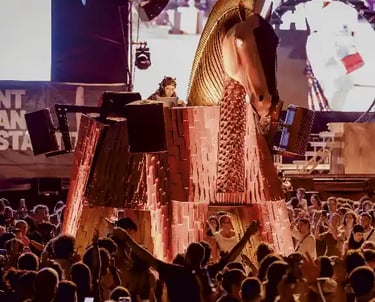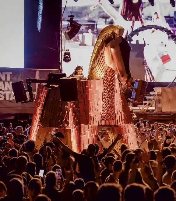 The artistic group LA LLATA (Baix Empordà, Catalunya) presents CAVALL DE TROIA, an artistic and festive version of the iconic Greek figure. The dynamic structure withholds a platform inside conceived as a stage to welcome any kind of artistic proposal, be it theatrical or musical.
